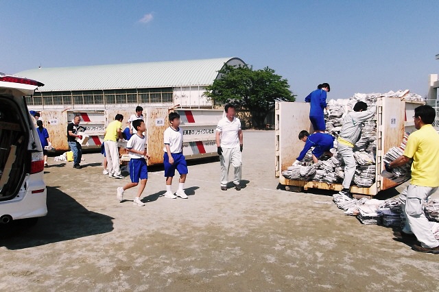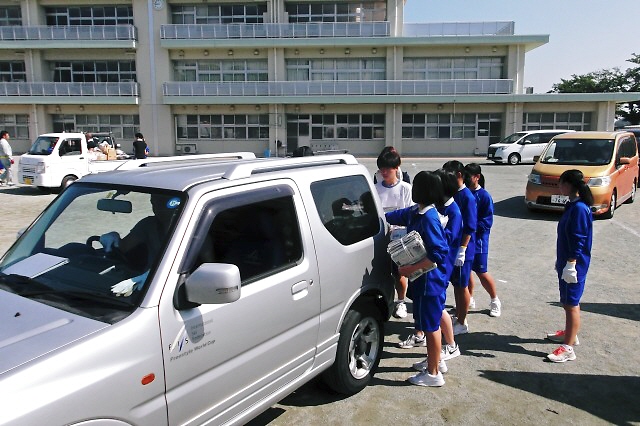 車が到着しドアが開けられると、生徒たちは、荷物を素早く車から降ろして、コンテナに積み込みました。