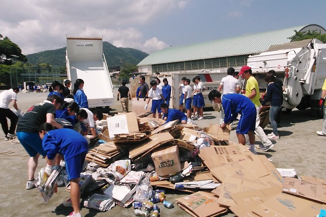 生徒会本部役員、級長・副級長、学区外からの通学生等は学校に集合し、各地区から運ばれてきた資源物をコンテナに積み込みました。