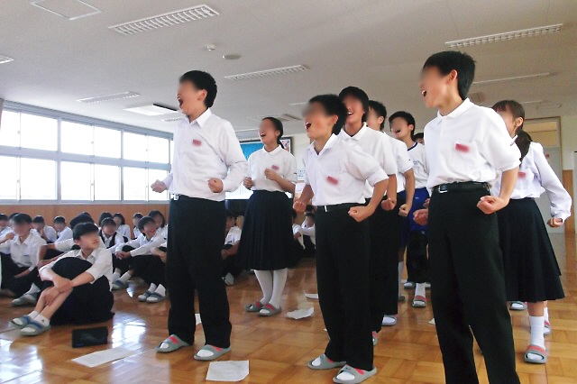 全員がワークシートを持って起立し、時計回りに一回しながら4方向を向いて会話文を読みました。