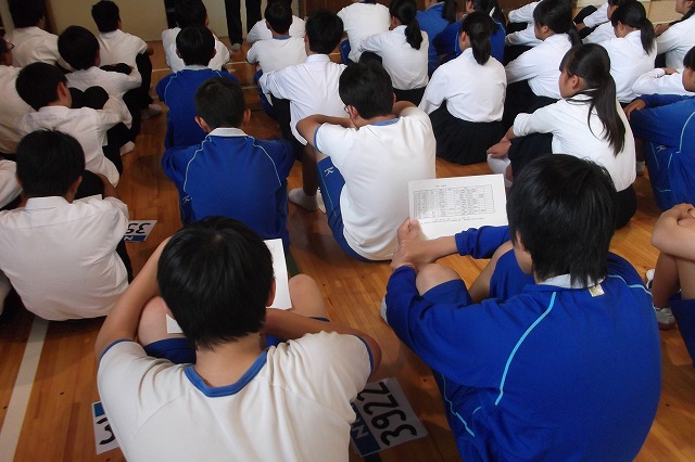 伊勢市中学校連合陸上競技大会に向け、3年生の応援団員が、お昼休みに多目的教室に集合。
