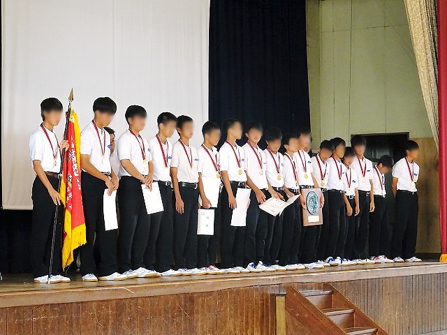 夏休み中に行われた各種大会で表彰された生徒に、全校生徒の前で賞状等を手渡しました。