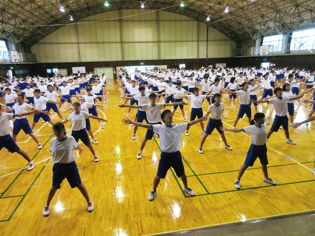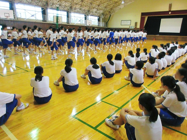 午後からは、時折雨が降る天候であったため、体育館で全校練習を行いました。