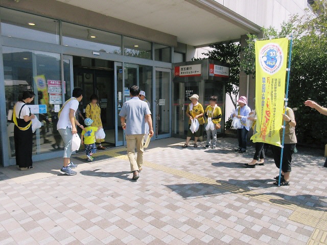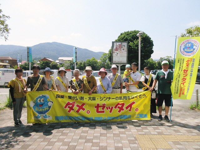 そして、青少年健全育成協議会の地域の皆さんが、腕章やタスキを身に付けて、三重県作成の『ダメ。ゼッタイ。』のリーフレットやティッシュ、絆創膏、うちわなどを配り、薬物乱用防止を呼びかけました。