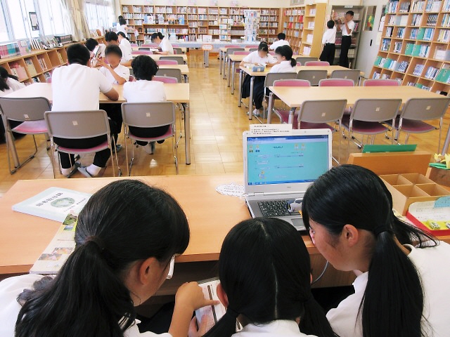 夏休み前の図書館は、生徒たちが読みたい本を見つけられるように展示の工夫が図られ、お昼休みは大賑わいです。