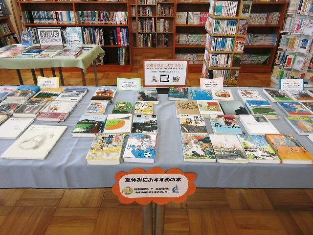 図書館の後ろの方には、テーブルを2つつなげて、夏休みに向けた新コーナーが設けられています。