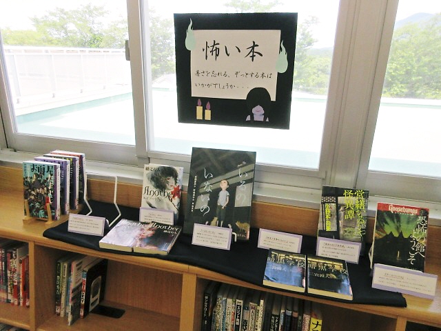 窓際の本棚の上には、「怖い本」のコーナーもあります。