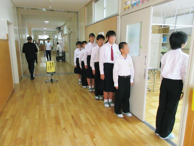 保健室前の廊下に、クラス単位で列を作って静かに待ち、順に入室。