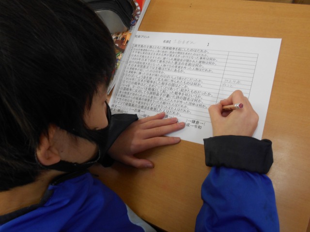 今日(2/23)を含めて、6年生が卒業するまでに登校する日数は38日です。昨日(2/22)の社会の時間には、歴史学習の復習プリントをしていました。また、放課後、6年担任団で「6年生算数まとめテスト」を作成していました。現時点で、これまでの学習の定着を自身で確認し、中学校に向けて基礎学力をつけておく必要があります。忘れてしまったことは、もう一度、復習をしっかりしてもらいたいと思います。