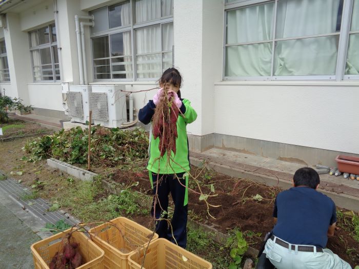 C組の生活単元の時間に取り組んでいるサツマイモの収穫を行いました。大きなサツマイモがたくさん土の中から出てきました。大豊作でした。収穫したサツマイモの一部は文化祭で試食できる予定です。楽しみにしてください。