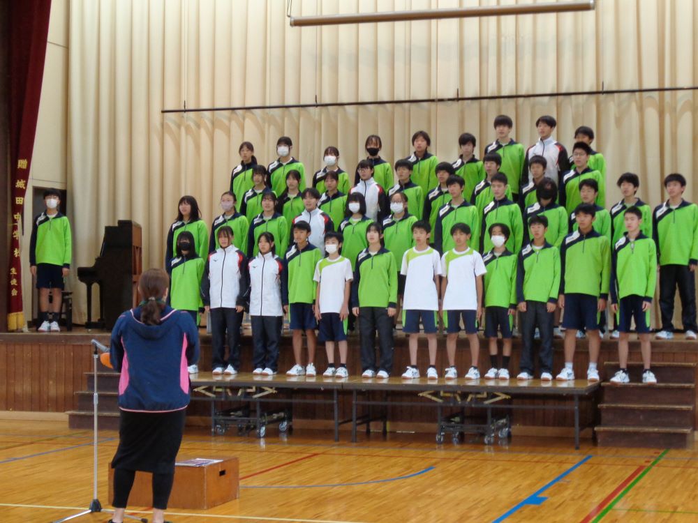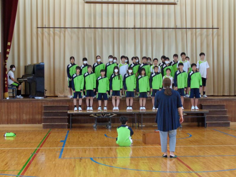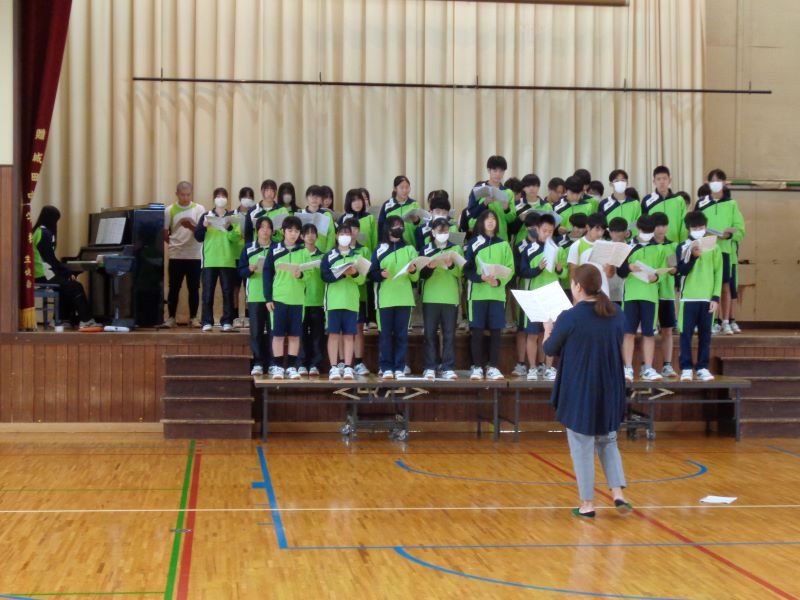 文化祭に向けての学年合唱の練習を行いました。本番と同じ体育館で、1限目に2年生が学年練習を行いました。