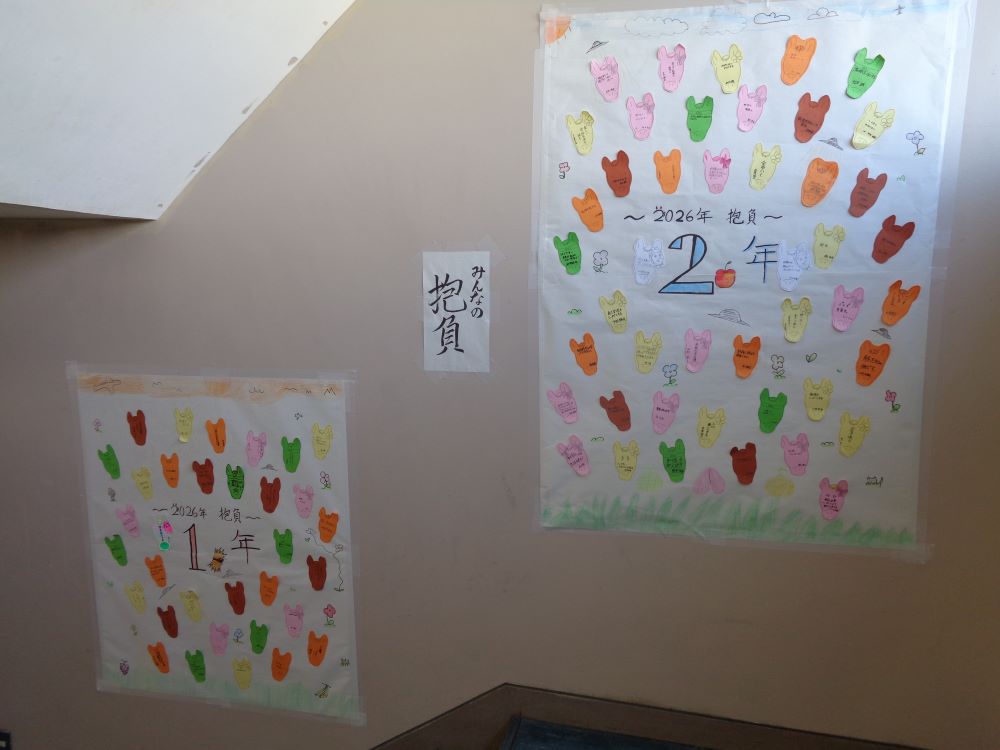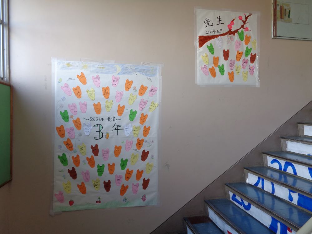 生徒会本部で企画した令和8年のうま年にちなんだ馬の形をした絵馬を階段に掲示してくれました。全校生徒と職員の今年の抱負がそれぞれに書いてあります。
