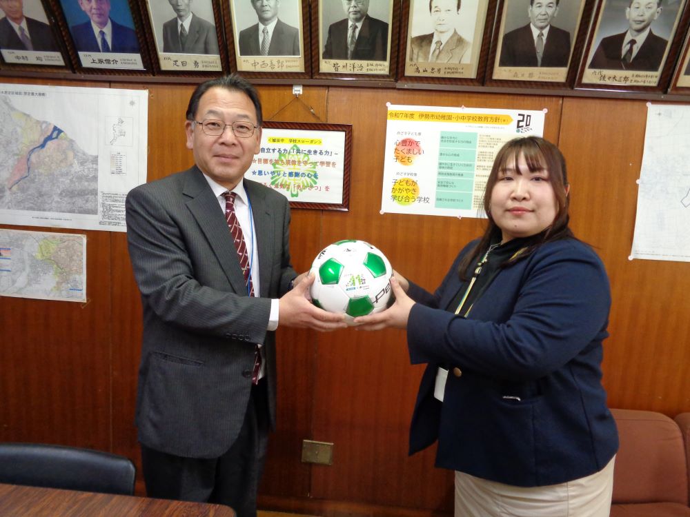 J.LEAGUEのタイトルパートナーである明治安田生命保険相互会社さんからサッカーボールを寄付していただきました。「未来世代応援アクション with Jリーグ」の一環で全国の小・中・高校にサッカーボールを寄贈している活動を行っていて、今年度、城田中学校が選ばれたそうです。保健体育の授業で大切に使わせていただきます。