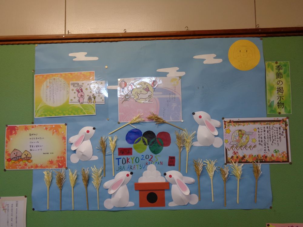 C組は、毎月生活単元の時間に季節の掲示物を制作しています。9月の掲示物が校長室前に掲示してあります。
