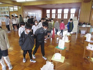 今日から三日間、児童作品展を行います。それに先立って、全校児童が頑張って取り組んだ作品の鑑賞会を1限目に行いました。各クラス単位で、2階から4階のワークスペースと教室前の廊下に展示された図工作品と書写作品を見て回りました。「校舎の絵、上手やな」「すごくキラキラでかわいい帽子」「毛筆の『木』、しっかりかけとる」などと、一人ひとりの頑張りを認める感想の言葉をたくさん聞くことができました。