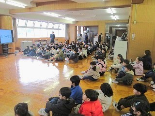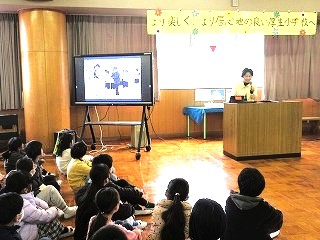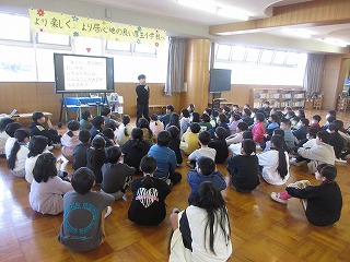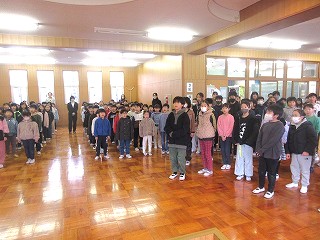 続いて、生徒指導担当の角先生から、元気いっぱいの楽しい冬休みになるように、特に「ありがとうを伝えよう」「きれいにしよう」を心がけましょうという話がありました。3学期は1月8日(木)から始まります。休み中、子どもたちに楽しい思い出がたくさんできることと、3学期初日にみんなが笑顔で登校してくることを願っています。
