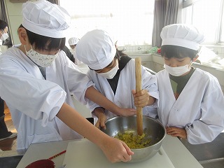 若竹学級の子どもたちが調理実習を行いました。今日、チャレンジしたのは「スイートポテト」でした。初めに、調理の手順について先生から話を聞き、3つのグループに分かれて、使う道具の準備と調理に取りかかりました。とてもスムーズに作業を進め、さつま芋の皮をピーラーで手際よく上手に取るのでとても驚きました。その後は、芋をお湯でゆでてからつぶし、砂糖、バター、牛乳で味付けをし、オーブントースターで焼いて出来上がりです。味見をさせてもらいましたが、甘みの加減がよく、美味しくできたスイートポテトにみんな満足していました。