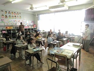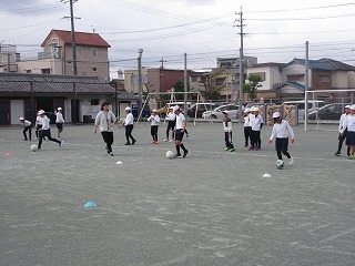 4年生の4限目は、体育の授業でした。1組は体育館で、ミニバスケットボールを行っていました。まだ、練習の段階で、ゲームは行わずに、パス(チェストパス・バウンズパス・オーバーパス)の練習を中心に行っていました。2組は運動場で、初めに3分半走を行いました。ねらいは自己記録に挑戦です。その後はサッカーに移り、ドリブルの練習を行いました。ここでは、自分の体からボールをあまり離さずに細かく蹴って、ドリブルのスピードを上げることにチャレンジしていました。