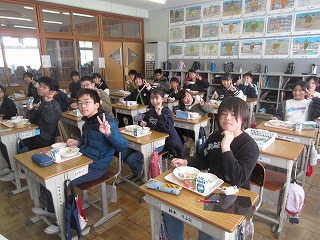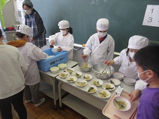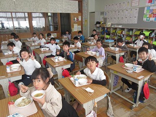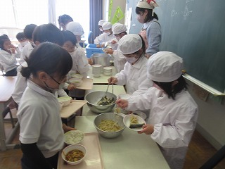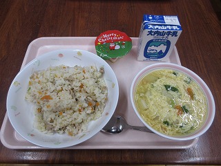 今日は最高気温が12度を超えましたが、朝から風が吹き、少し肌寒さを感じる一日となりました。給食には、牛乳、ポークピラフ、冬野菜のぽかぽか卵スープ、お楽しみデザートが出て、子どもたちが大好きな献立でした。盛り付けが終わると、食缶が空の状態になっている学級がほとんどで、1年生も6年生もニコニコとした表情で美味しそうに食べていました。子どもたちの感想の言葉には「ピラフの肉が美味しかった」「このピラフやったら何杯でも食べられる」「デザートが甘くて美味しかった」などがありました。温かな美味しい卵スープで心も体も温まりました。2学期の給食も残り2回、これからもみんなで給食を楽しんで食べましょう。