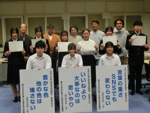 例年、中学校と小学校から募集している厚生中学校区健全育成協議会標語が下記のように決定しました。今年度は、「多様性」と「Youtube(SNS)」がテーマとなりました。最優秀の標語は、学校のフェンスに掲示される予定です。