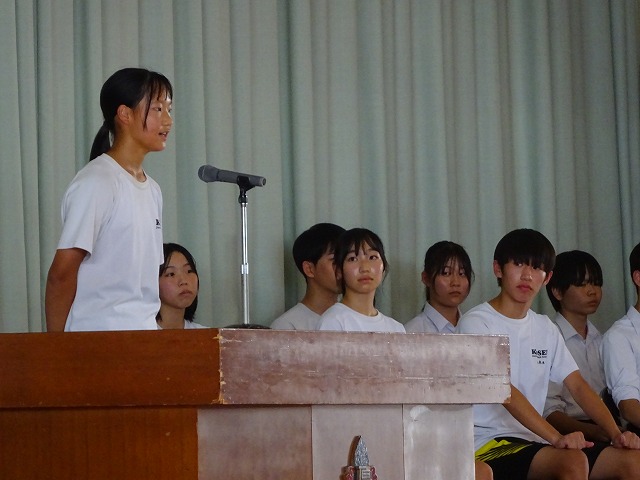 地域・学校交流事業終了後に、健全育成標語の表彰を行いました。各学年より最優秀1人、優秀2人の計3人が入賞しました。厚生中学校から最優秀に選ばれたのは次の3点です。「ありがとう 心がほっと 温まる」(1年)、「『夢がある』 その一言で 色づく世界」(2年)、「勇気ある 君の行動に感謝」(3年)。定期テストと重なった3年生を除く1,2年生の入賞者6人に、健全育成会役員から表彰状が授与されました。3年生の表彰は、翌日校長室で実施しました。最優秀の標語は、学校のフェンスに掲示される予定です。