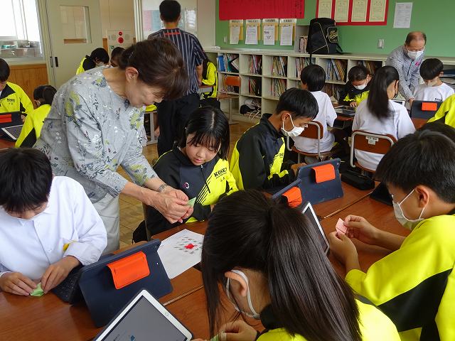 CS(コミュニティスクール)地域交流部会の皆さんにご来校いただき、1年生と一緒に千羽鶴の作成を行いました。この千羽鶴は、毎年生徒会が中心となって作成し、8月の「広島平和記念式典」に奉納します。
