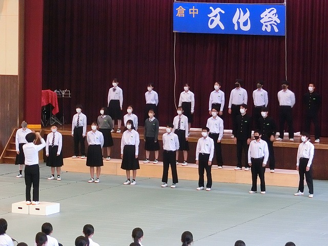 10月29日(土)に令和四年度の文化祭を開催しました。吹奏楽部のたいへん素晴らしい演奏でオープニングを迎えました。今年度は「駆け上がれ!倉中の青春坂」をテーマに、合唱コンクールを中心に行われました。その他にも、生徒会の動画配信、保健委員会のクイズ、学習成果の展示、文化総合部の作品展示など工夫を凝らした、内容の濃い文化祭となりました。合唱コンクールは、どのクラスも、リハーサル以上の素晴らしい合唱でした。1年生も2年生もそれぞれが、心と歌声を合わせて、難しい曲をしっかりと歌いこなしていました。その中でもやはり3年生は、どのクラスも歌詞の内容を十分感じ取り、自分たちの思いを歌に込め、そしてまさしく心を一つにして、素晴らしい合唱を聴かせてくれました。どのクラスも心に残る素晴らしい合唱でした。ありがとう。