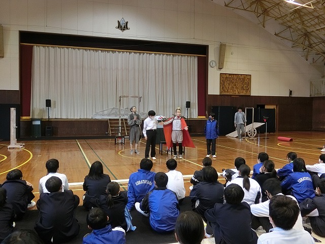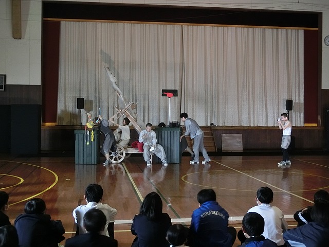 11月30日(水)に、文化庁が勧める「文化芸術による子供育成推進事業」として、倉田山中学校の1年生が、国内外で活躍される「カンパニーデラシネラ」のみなさんによる、演劇を鑑賞しました。7月には事前に来校され、2クラスだけでしたが、ワークショップを行っていただきました。