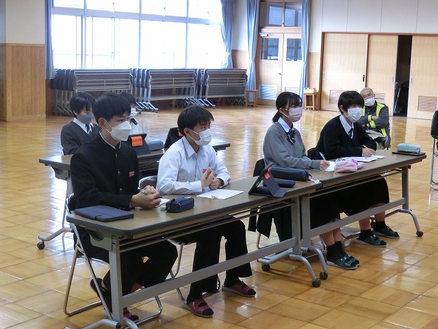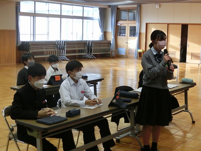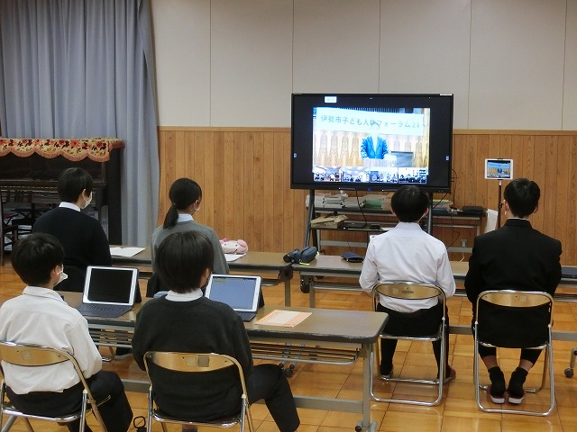 12月7日(水)に、伊勢市人権フォーラム21(中学生)が開催されました。今年もコロナ禍であるため、オンラインで各校を結び、意見交換がなされました。本校の参加者は各学年から代表として、1年生 中林万葉さん、橋本悠佑さん、2年生 山川蒼司さん、徳津翔太さん、3年生 尾上菜乃羽さん、岡田結里葉さんが参加しました。フォーラムは、伊勢市の中学生の中から選ばれた2つの作文発表があり、その後それぞれの作文を聴いて、各自が意見や感想を述べました。また、伊勢市教育委員会事務局の人権担当者からの感想や助言などもあり、約1時間半でしたが、市内の中学生の意見や感想などを聞くことができ、人権に対する様々な考えや、気づきがあった、大変有意義な時間を過ごすことができました。このフォーラムに参加してくれた代表生徒が、今度は各学年に還元し、全校生徒が改めて人権とは何かを考える機会に、さらに人権を守る行動をして欲しいと思います。