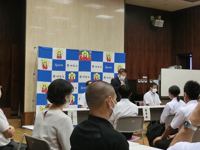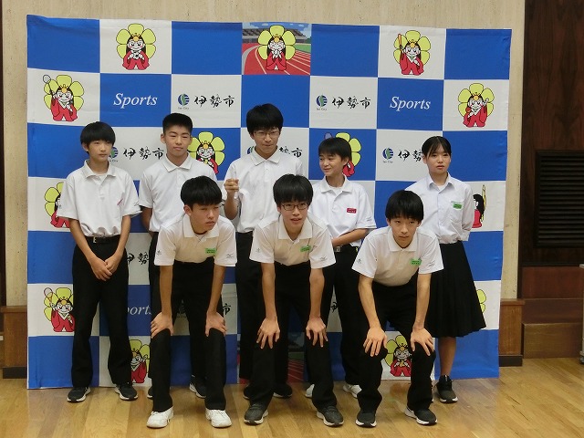 16日、東海大会を見事勝ち抜き、全国大会に出場する選手の激励会が、小俣総合支所で行われました。全国大会に出場する選手は、本校バドミントン部8人と市内の陸上部12人の計20人です。最初に顧問の先生から挨拶があり、森先生からは、ここまで支えてくださった家族や周りの人に感謝し、全力を出し切ってほしいとの言葉がありました。続いて、各選手の自己紹介と、抱負を述べてもらいました。最後に岡教育長から、出場選手への激励の言葉をいただきました。それぞれが、自分の思いを胸に、全国大会に臨んでくれると思います。会場は青森県弘前市です。健闘を祈ります。