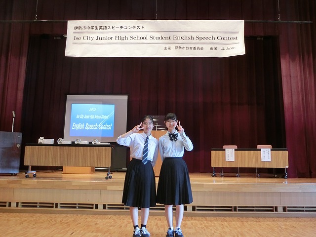 19日に、伊勢市中学生英語スピーチコンテストが開催されました。今年度は、小俣図書館に出場者が集まり、「将来の夢」「大好きなもの」などをテーマにスピーチコンテストが開かれました。各中学校の代表19人が出場し、倉田山中学校も、3年3組 酌井柚花さんと、3年5組 奥村碧さんが出場しました。酌井さんは「Let’s Encourage Students to Try Challenging Things」奥村さんは「Sharing Matcha with the World」というタイトルでスピーチしてくれました。どちらも大変素晴らしいスピーチでした。結果は奥村さんが、優秀賞に輝きました。