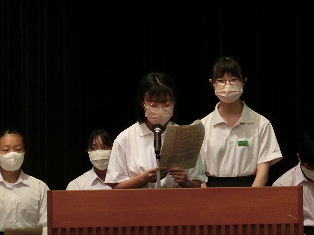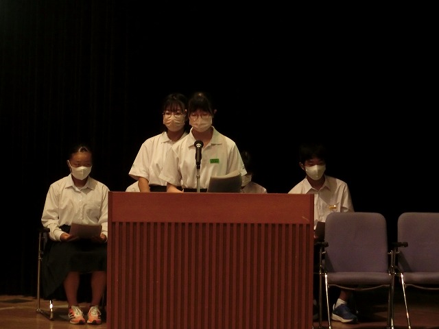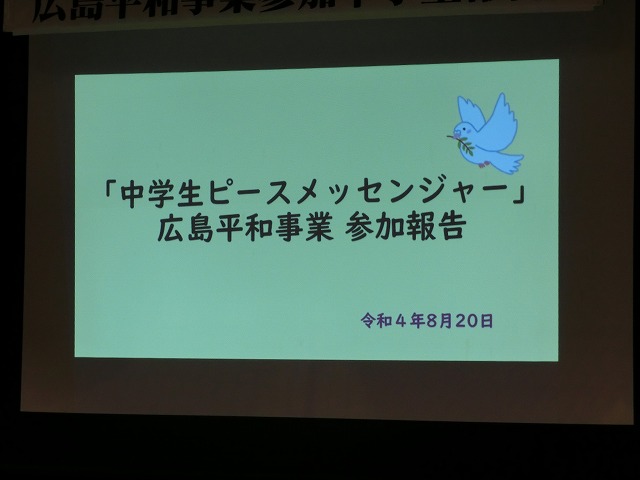 20日に、ハートプラザみそので「中学生ピースメッセンジャー」広島平和事業参加報告会がありました。ピースメッセンジャーとして、各中学校の代表者が「平和」を多くの方々に伝えてくれました。本校の酌井さんは「原爆が落とされてから、77年がたち、語り部の方々が年々少なくなる中、私たちが正確に話を聴き、後世に語り継いでいかなければならない」、岡田さんは「人に優しく接し、差別意識を持つのではなく、まず相手を知ることから始めるなど、争いが起こることを避けることが必要。被爆体験を伝え、みんなに届ける架け橋になりたい」とそれぞれが感想を述べ、平和を訴えてくれました。他の各校の代表者のみなさんも感想を述べるなど、市民のみなさんに強く平和を訴えてくれました。
