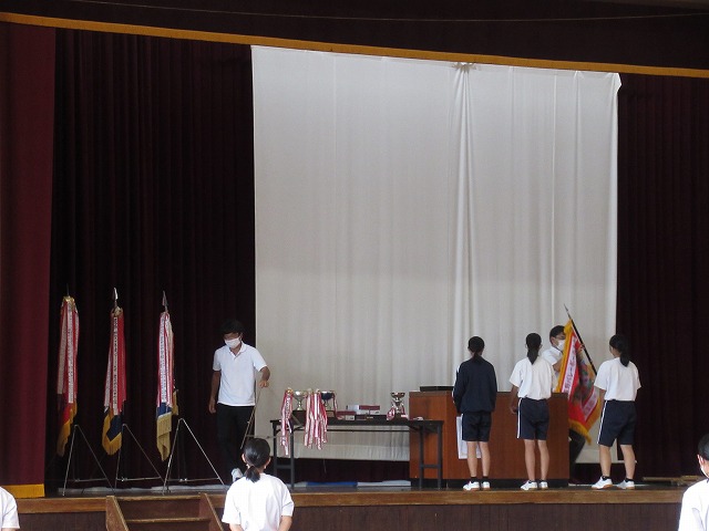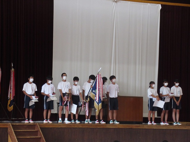 夏休み中に、3年生を中心に部活動など様々な活動を通じて、表彰していただいたものを、学校でも伝達しました。これまでに「倉中だより」で紹介しました。随分たくさんの表彰でした。これからも自分の得意な所をどんどん伸ばし、運動だけでなく、様々な分野で倉中生の活躍を期待しています。