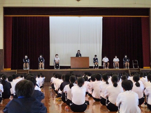後期生徒会本部役員が決まりました。9月30日(金)に立会演説会並びに投票がありました。定数以上の生徒が立候補してくれました。できることなら、各自のやる気を尊重し、全員に本部役員として、活躍してほしいところでしたが、選挙になりました。役員に選ばれた人は次のみなさんです。ぜひ、一人ひとりの活躍を期待しています。