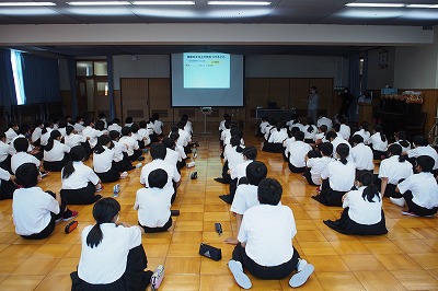 今日は5・6限目に1年生が栄養教諭の先生から「給食と中学生の食事」という題で食育授業を受けました。小学校と違って中学校では共同調理場でつくっていることや、その施設の中の作業の仕組みについて教えてもらいました。また、中学生でしっかり食べることがとても大切で、残食を減らすにはどうしたらよいか考える内容でした。体を作るには食べることもトレーニングです。しっかり食べていってください。