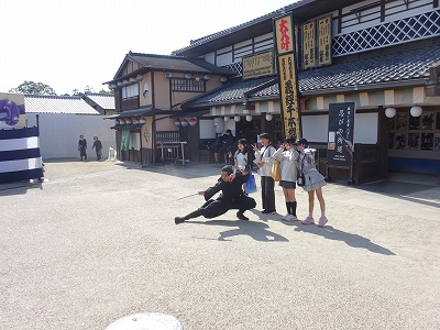 映画村では昼食でカツカレーを食べたあと、アトラクションとお買い物を楽しみました。侍や忍者、妖怪と出会いました。 これから帰路につきます。