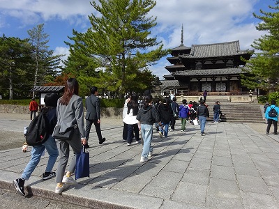 法隆寺では飛鳥時代の建築様式を今に伝える五重塔や金堂などを見て回りました。次は京都に向かいます。