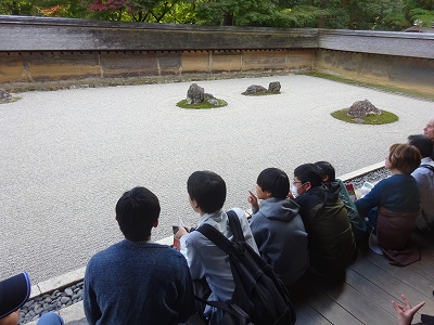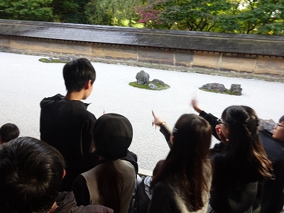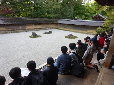 禅の精神が秘められているとされる日本を代表する枯山水の石庭を見学しました。次は金閣寺に向かいます。