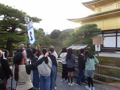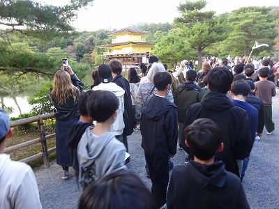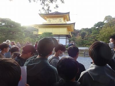 ピカピカに光る金閣寺を見学しました。公家文化と武家文化が融合した建物を間近に見ることができました。次は宿に向かいます。