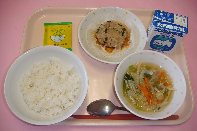むぎごはん牛乳てづくりジャンボシューマイぐだくさんスープやさいふりかけ
