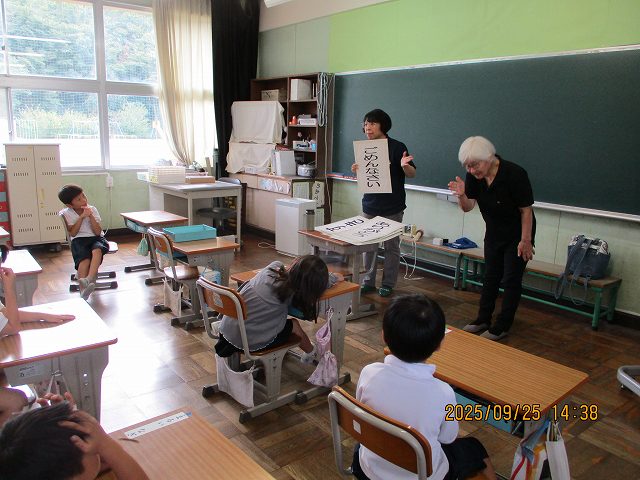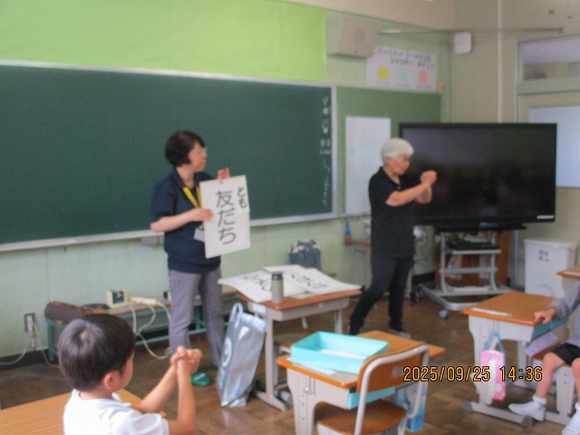 1学期の4年生に続き、2学期は1年生が手話教室を開きました。講師は、前回と同じ方々で、本校に今年2回目の来校です。