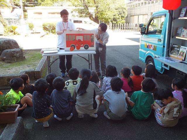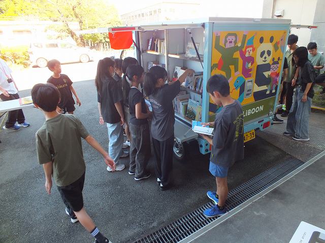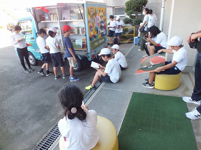 伊勢市図書館の移動図書館「ツペラツペラ号」がやってきてくれました。とても特徴的なデザインで、読書意欲をそそる様子です。