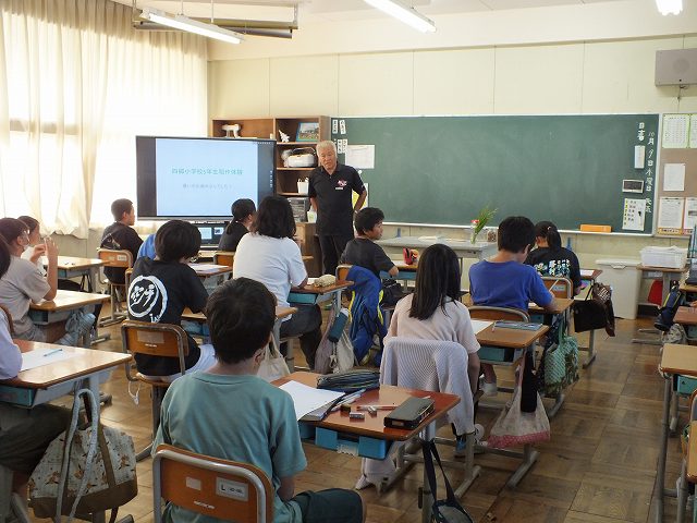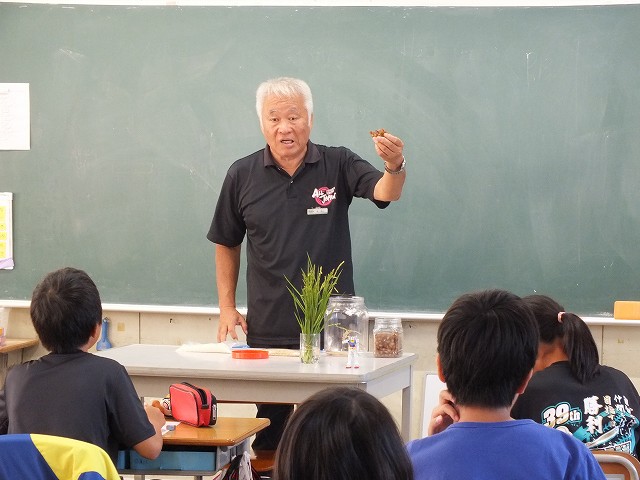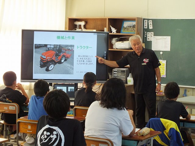 稲刈りをしたのち、一連のコメ作りの学習をとおして、知りたいこと、質問などについて、おしえてもらう、まとめ学習がありました。楠部町の区長にお越しいただき、使われている機械やその使い方などを詳しく教えていただきました。