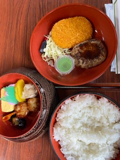 お昼は若草山でハンバーグ.コロッケ弁当。