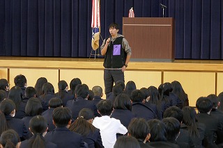 離任される先生たちが二見中での思い出などのお話をされた後、生徒会から花束を渡しました。