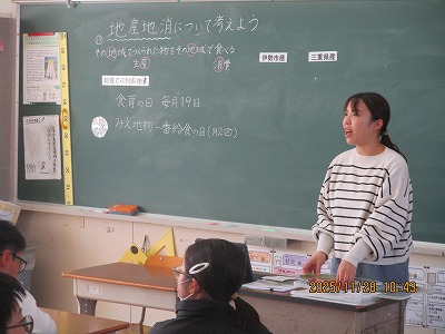 28日、5年生が食育の授業を行いました。地元で生産された農産物をその地域で消費する「地産地消」の授業でした。地産地消のメリットとしては、身近な場所だから新鮮で安心なことや、環境にやさしいなどがあげられます。給食でも米やネギ、いちごなど地元の食材を使って調理しています。スーパーにも地元の野菜が並んでいますので、手に取ってみませんか。