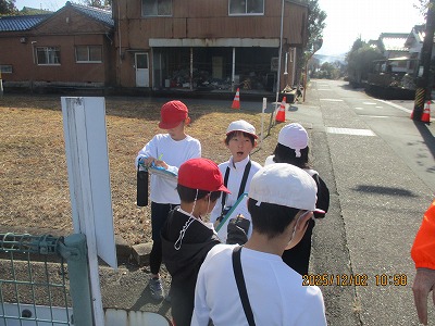 2日、3年生が自分たちの暮らす地域や通学路を探索しました。浜郷まちづくり協議会の皆様にも協力していただき、子どもたちの目線から、水路や自動車が多く通る場所など危ない場所を確認してきました。12月だというのに子どもたちは汗がにじんでいました。暖かい日でよかったです。