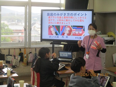 3日1限目2年生、2限目5年生が、学校歯科保健衛生指導事業を行いました。歯科医さんと歯科衛生士さんを招き、虫歯は歯の質や食べ物、食べる時間によってできることやブラッシングによって歯茎を傷めない最適な歯ブラシの使い方を教えていただきました。大人も歯のクリーニングをしたり、歯の磨き方を見直さないといけませんね。