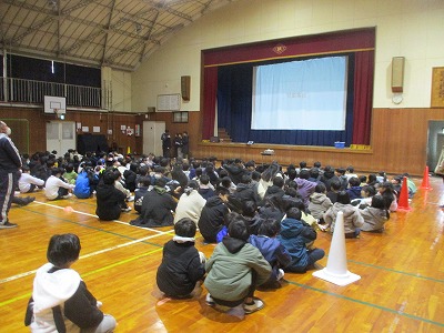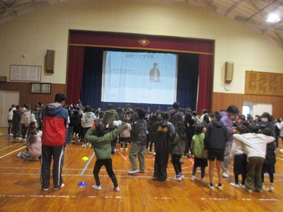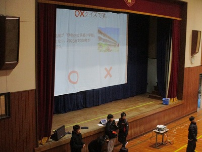 1限目体育館で児童会主催の児童集会をしました。学校に関する問題を〇✕や四択クイズで行いました。浜郷小学校の消火栓の数や、階段の数、先生のペットの名前などよく考えられた楽しい問題がたくさん出ました。学校の全学年が楽しく交流し、学校のこともいろいろ知ることができたように思います。後期の児童会のみなさんお疲れ様。よかったよ。