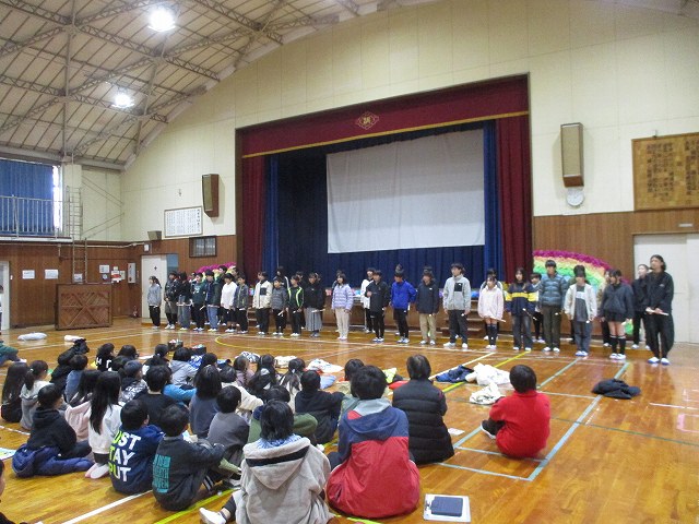 6年生の演奏の後、5年生の代表から挨拶がありました。最後に5年生が「Believe」を合唱する中、6年生は退場しました。感極まり、涙を流しながら歩く子どもたちの姿も見られました。5年生の進行はとても上手で、計画通りに時間ぴったりに終わることができました。それぞれの発表は、学年の良さが十分に発揮され、素晴らしい送る会となったと思います。