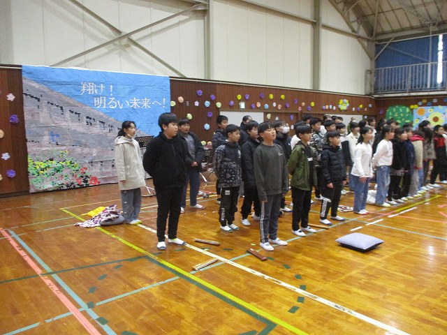 コロナの影響で思うように音楽の授業が進められなかった時期、3年生で初めて練習した「笛星人」。「シ」の音だけで1曲を構成しています。次に「メリーさんのひつじ」を演奏し、みんなで一緒に歌いました。そして最後は井上陽水の「少年時代」。しっとりとした演奏に、心がジーンと温かくなりました。在校生に向けての言葉も元気よく、最上級生らしい立派な姿を見せてくれました。